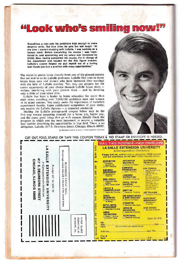 Notes: Lays flat, complete, small piece missing front cover, clean staples, creasing, stain on back cover, spine roll. See pics.