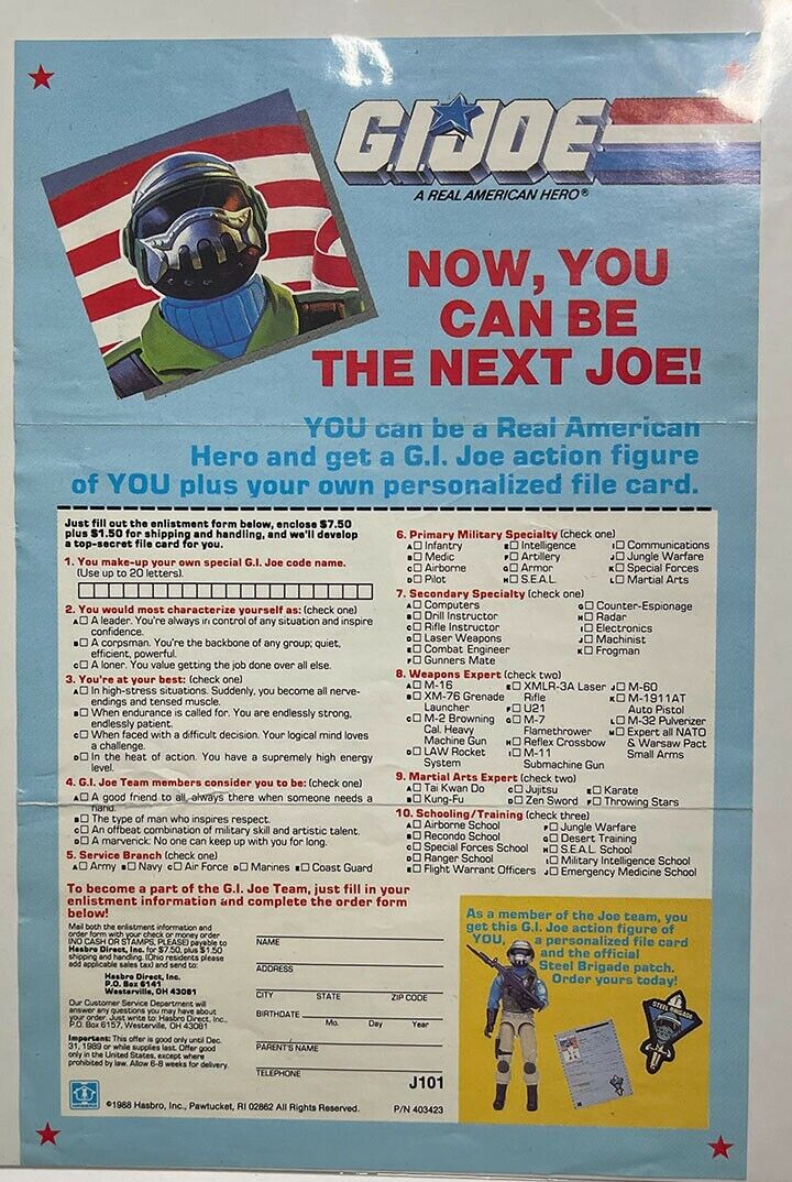 Figure is sealed in the original mail-away bag, complete with rifle, backpack, and Steel Brigade patch - amazing!! Figure comes with the original 1987 order form. This was a 1987 mail-away figure where you could fill out a form to make your own custom named GI Joe figure. There is a small tear in the bag.