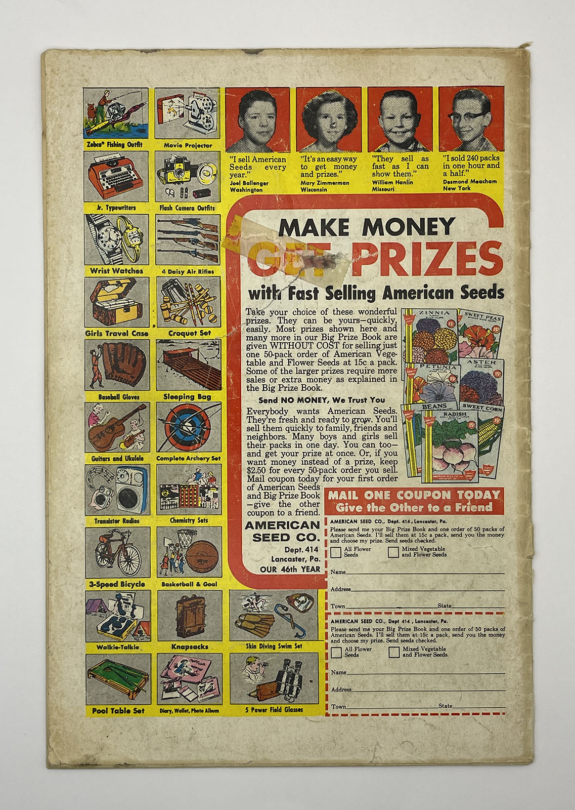 Notes: Lays flat, clean staples, bottom staple pop, tape on back cover, dust shadow back cover, complete, distributor overspray top. See pictures.
