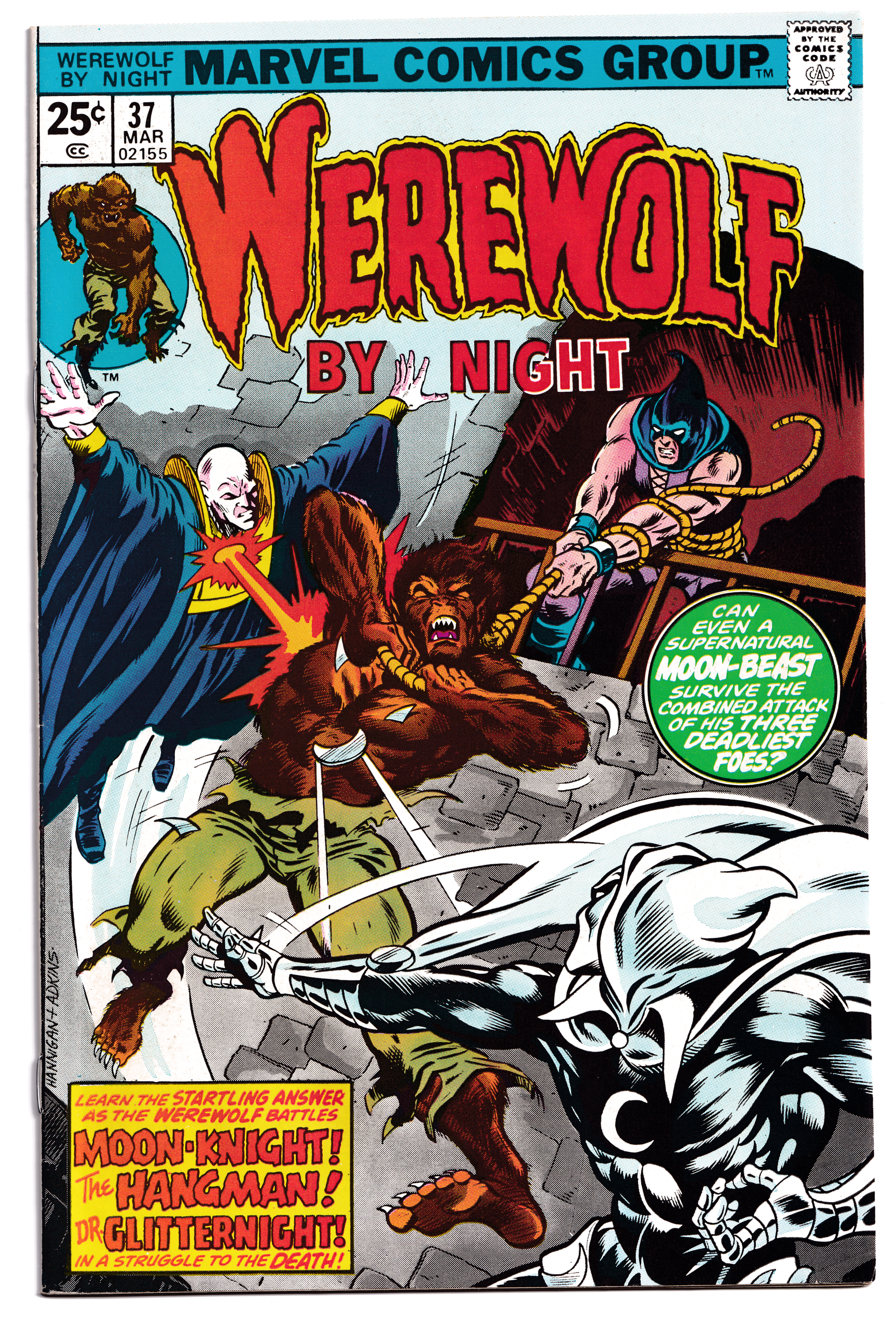 Written by Doug Moench with art by Don Perlin. Moon Knight, the Hangman, and Dr. Glitternight are all trying to take out the werewolf. Features the third appearance of Moon Knight! Very nice copy!